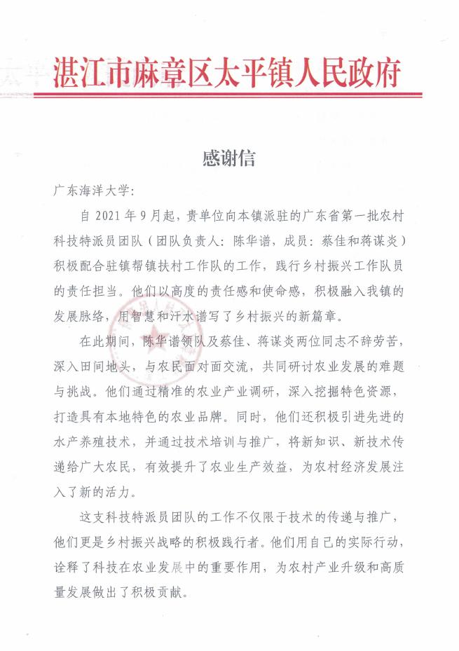 近日,英国365集团收到来自湛江市麻章区太平镇人民政府的感谢信及坡头区南三镇的锦旗,对学院派出的两支广东省农村科技特派员团队做出的突出贡献表示感谢。