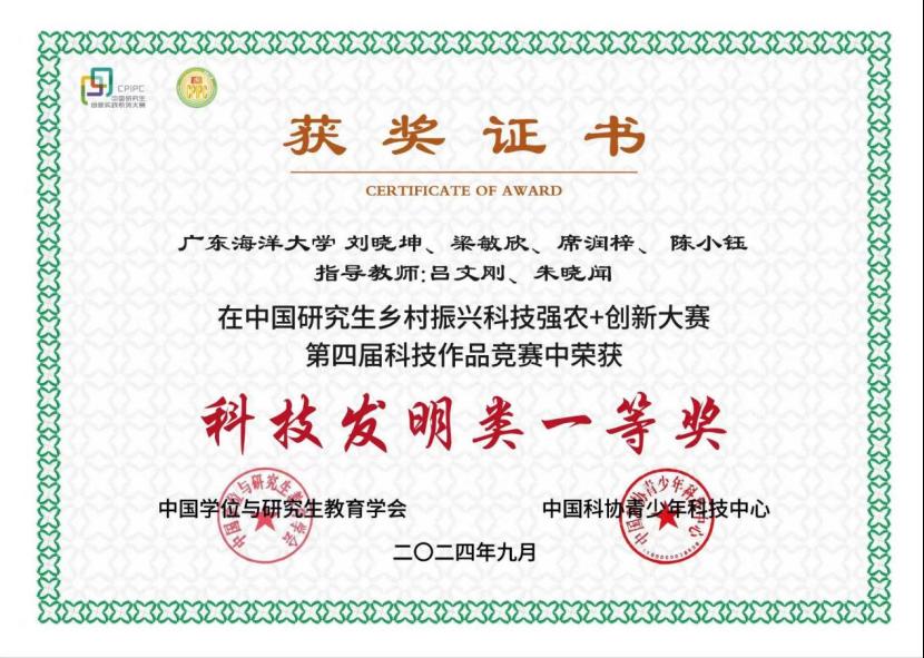 9月24日-28日,中国研究生乡村振兴科技强农+创新大赛第四届科技作品竞赛全国总决赛在黑龙江省哈尔滨市举行,英国365集团研究生刘晓坤、梁敏欣、席润梓、陈小钰等同学在众多参赛选手中脱颖而出,提交的作品《东风螺产业发展关键技术研发与示范应用》斩获一等奖。