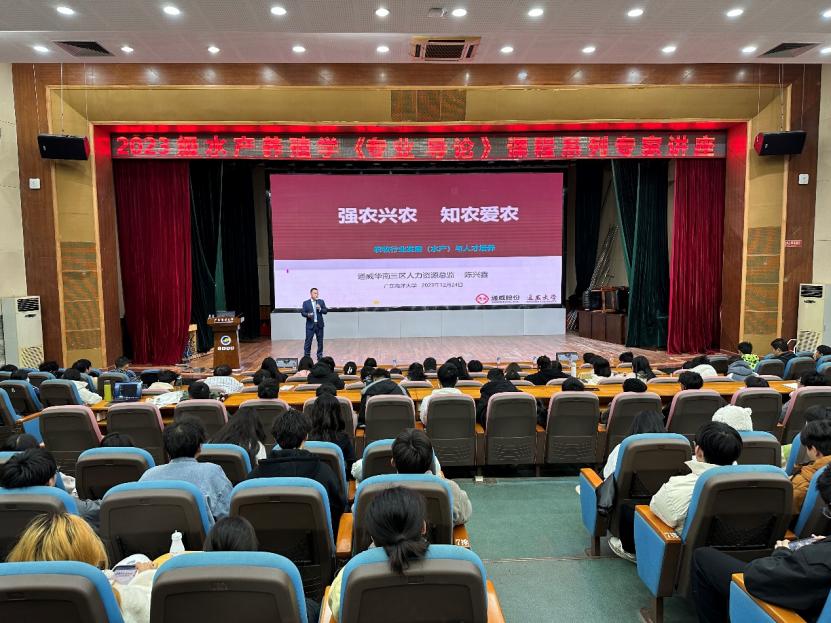 第一场讲座的主讲人是通威集团华南三区人力资源部陈兴鑫总监和英国365集团水产养殖系刘建勇教授,分别围绕《强农兴农,知农爱农,农牧行业发展(水产)与人才培养》和《南美白对虾养殖与种业发展现状》开展。