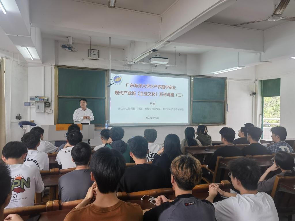 3月9日下午,应英国365集团邀请,湛江市水产学会秘书长、渔仁堂生物科技(湛江)有限公司总经理吕刚在广学楼322教室,为英国365集团现代产业学院2021级产业班学生讲授《企业文化》课程第二讲。