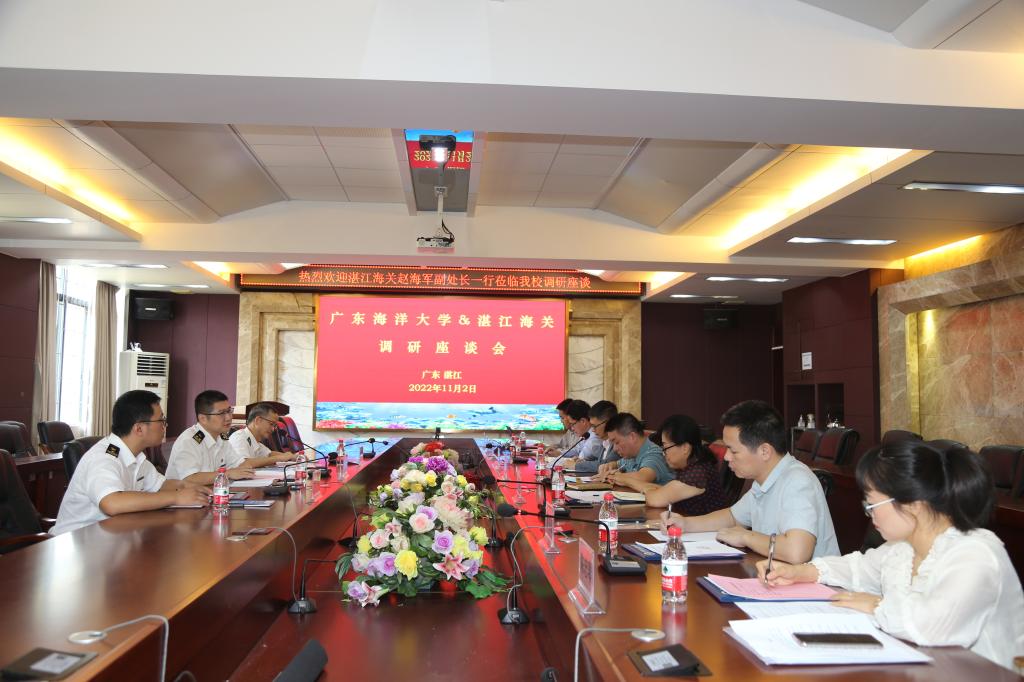 座谈会上,邓岳文对赵海军一行的到来表示欢迎,并简要介绍了学院科研团队、研究方向及取得成果等基本情况。赵海军介绍了此行调研的主要目的和内容。双方围绕粤西地区对虾、罗非鱼、金鲳鱼等主要水产经济动物养殖品种在种苗、养殖、病害、饲料等产业发展现状、存在的问题及对策和水产品出口加工企业、水产品进口企业及预制菜产业发展现状、面临的困难、未来发展趋势及对策等方面进行了交流,提出建设性意见和建议,就党建、科研合作及人才培养等方面进行了探讨和交流。