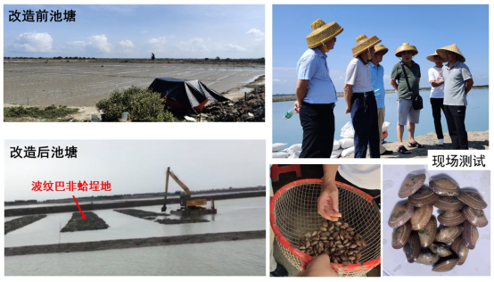 自2020年起,赵力强副教授在粤西地区开展了波纹巴非蛤池塘多营养层次综合养殖模式研究,在池塘升级改造基础上,解决了品种搭配、水质调控、敌害防控、采捕方式等关键技术难题,构建了波纹巴非蛤—白虾—黄鳍鲷综合养殖模式,并利用波纹巴非蛤大规格苗种(500粒/kg)开展了优化试验。经专家组现场测试,波纹巴非蛤在池塘的生长速度较海区提高了31%,成活率提高了16%,亩产值提高了4500元,实现了经济效益和生态效应双赢,为推进池塘养殖转型升级、促进产业绿色发展、推动乡村全面振兴提供了关键技术支撑。