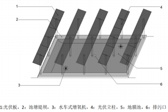 “地膜—光伏整合”工程化水产养殖系统将大幅提升单位国土面积的价值输出,实现土地复合利用,真正实现了“渔、电”双丰收,直接推动中国水产养殖业的转型升级,加快中国能源结构调整步伐,推进中国能源革命进程。“地膜—光伏整合”工程化水产养殖系统主要由地膜池养殖系统和光伏发电系统两大系统组成。光伏发电系统由光伏板和立柱两部分组成。地膜池养殖系统由地膜池塘、增氧系统、进排水系统和尾水处理系统组成。进水系统经过水产养殖用原水的沙滤装置过滤。养殖动物的残饵及虾壳等采用地膜养殖池排污装置排出池外。尾水处理主要采用三级养殖尾水处理系统。该项目共完成文章4篇,已经见刊3篇,1篇SCI在审,获得授权国家发明专利4项,实用新型专利8项。