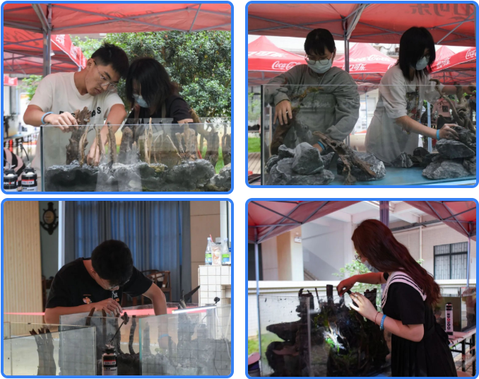本届大赛的决赛分为大缸组、中缸组及小缸组三个组别进行,均为实操技能考核。4月16日上午10点开始,各参赛队伍在水产楼开始搭建并制作水族箱作品,挑石块、洗底砂、建构架,拼沉木……,一次次的思维碰撞,一次次的制作尝试,一个个美轮美奂的水族箱艺术作品逐渐成型。选手们热情高涨,相互协作,忙的不亦乐乎。来自园林专业的选手黄同学谈感受道:水族箱造景看似简单,实则需要许多专业知识与相关技巧,如水草的习性特征、石头沉木的选择等,参加水族箱景观设计大赛,可以有效减缓压力,满足我们对自然风景的渴望。