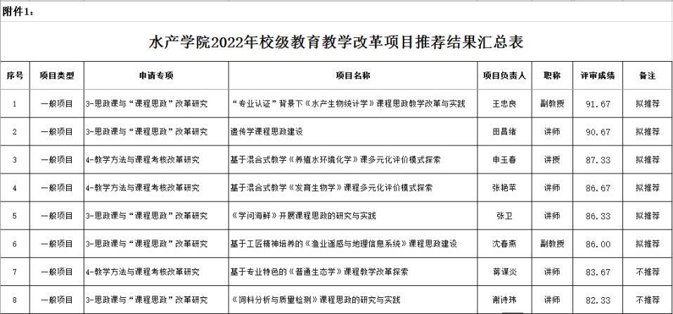 附表1:英国365集团2022年校级教育教学改革项目推荐结果汇总表