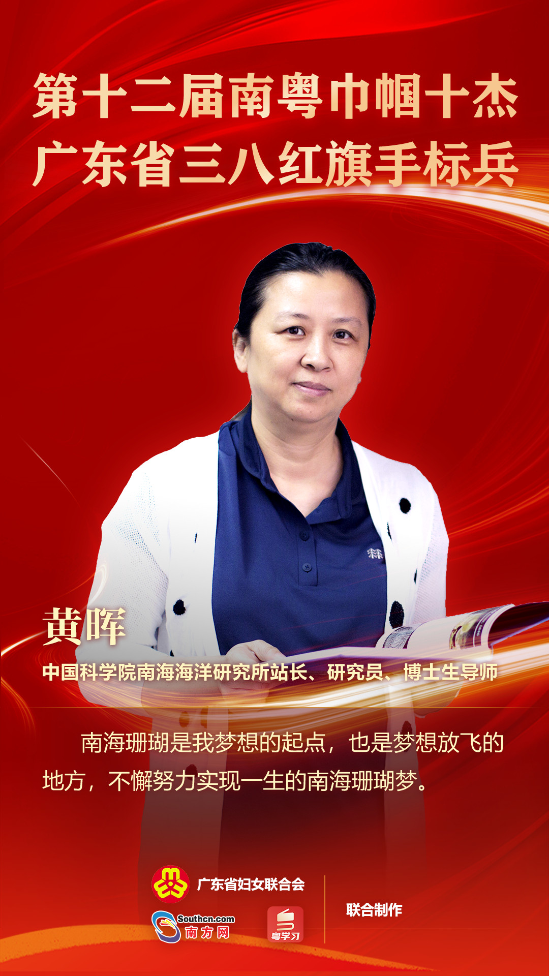 3月1日,广东省妇联在广州举办广东各界妇女纪念“三八”国际妇女节112周年座谈会。会上对我省各届先进妇女代表和集体进行了表彰。其中,省妇联围绕科技创新主题,评选了第十二届南粤巾帼十杰,同时授予广东省三八红旗手标兵称号。我校校友、中国科学院南海海洋研究所研究员黄晖榜上有名。