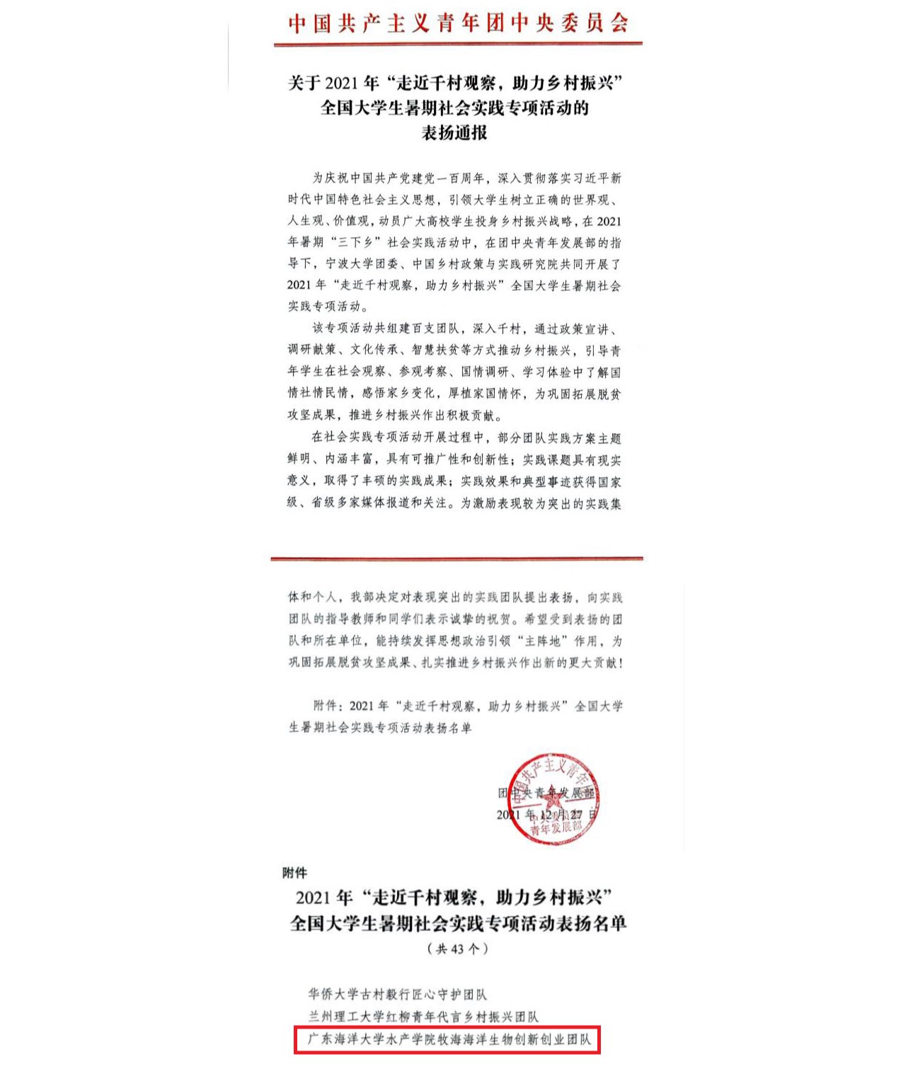 近日,英国365集团牧海海洋生物创新团队受团中央发文表扬,此次团中央发文表彰2021年“走近千村观察,助力乡村振兴”全国大学生暑期社会实践专项活动,广东省共有3所高校受到表彰,我校是其中之一。