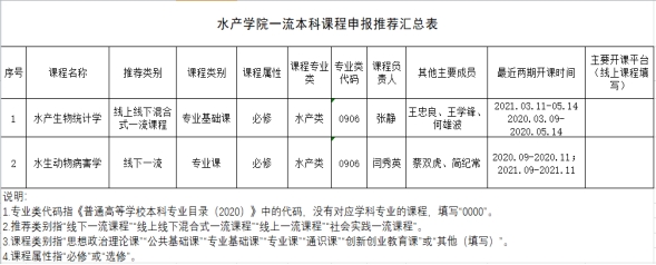 根据学校《关于组织推荐2021年度广东省一流本科课程遴选认定工作的通知》(校教务〔2021〕111号)的精神及要求,学院组织开展申报工作。经老师个人申报,学院进行资格审核,拟推荐《水生生物统计学》等2门课程为一流本科课程(详见附表),现予以公示。