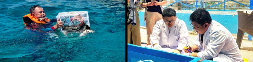 人工鱼礁投放和鱼苗增殖放流是此次合作的重点任务,我校王学锋教授率团队在增殖放流工作中发挥了重要作用。该团队承担了确定放流物种、监测鱼苗健康状况以及确保放流过程科学性和效果的重要任务,在望加锡海域放流了4种高经济价值鱼种和2种贝类,共计2万尾鱼和400粒砗磲(鳞砗磲Tridacna squamosa和砗蚝Hippopus hippopus各200粒)。通过精准的放流策略和技术支持,不仅促进了渔业资源的恢复与增殖,也为当地海洋生态系统的可持续发展提供了有力支持。该项工作的开展标志着中印尼在海洋生态保护与渔业可持续发展合作上的重要进展。