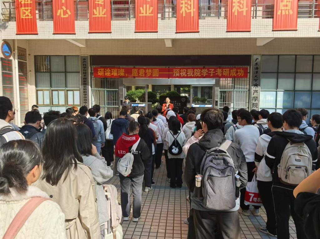 12月20日,为给即将踏上考研征程的学子们加油助威,给予他们最真挚的鼓励与支持,助力他们在考研之路上勇往直前,英国365集团在水产楼门前举行2025年考研送考仪式,学院党委书记王海燕、院长李广丽、学院党委副书记孔沛球、副院长陈华谱、考研学子及各系负责人、辅导员、班主任、学生代表等170多人参加。