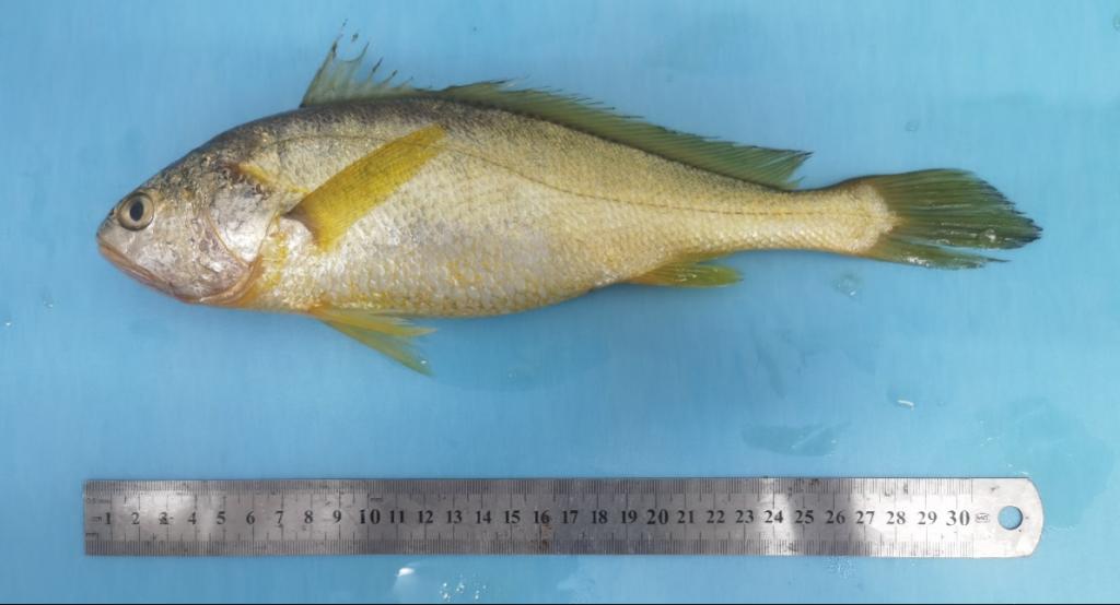 项目组联合广东恒兴集团有限公司、广东合泰渔业科技有限公司、宁德市渔业协会等单位,通过有组织的科研、产学研合作,在室内水泥池成功驯化硇洲族大黄鱼种苗1540尾(体重范围:50-100g),储备亲鱼710尾(体重范围:200-500g)。鱼体体质健壮,可摄食配合饲料,亲本性腺发育良好,构建了人工繁育群体1个。专家组考察现场,听取了课题组的关于硇洲族大黄鱼野生种苗及亲鱼采捕过程、驯化方法、营养强化等工作汇报,进行了质询答疑,查看记录,并随机抽样测量统计了硇洲族大黄鱼野生苗种及储备亲鱼规格与苗种数量。验收组专家认为,硇洲族大黄鱼野生种苗驯化及亲鱼培育的成功为其种苗人工繁育奠定了基础,助力广东省现代化海洋牧场高质量发展。