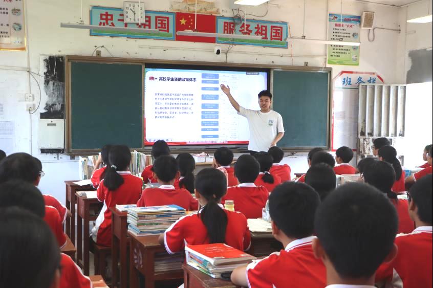 在班级宣讲环节,英国365集团党委副书记孔沛球首先作简短发言,他强调,国家资助政策是覆盖全学段的“安全网”,旨在为渔乡学子扫清求学障碍,助力学子“扬帆远航”。随后,国家励志奖学金获得者李声钊结合自身经历详细介绍了国家资助政策如何支撑自己完成学业——从生源地助学贷款解决学费问题,到国家励志奖学金缓解生活压力,再到校内勤工俭学岗位提供实践机会。他特别提到:“这些资助不仅让我无需为经济问题担忧,更让我能全身心投入科研实践,专注于个人的全方面提升。”李声钊的分享引发学生的热烈共鸣,一名初一学生感慨:“原来资助政策能实实在在改变命运,我也要像李学长一样勇敢追逐大学梦。”