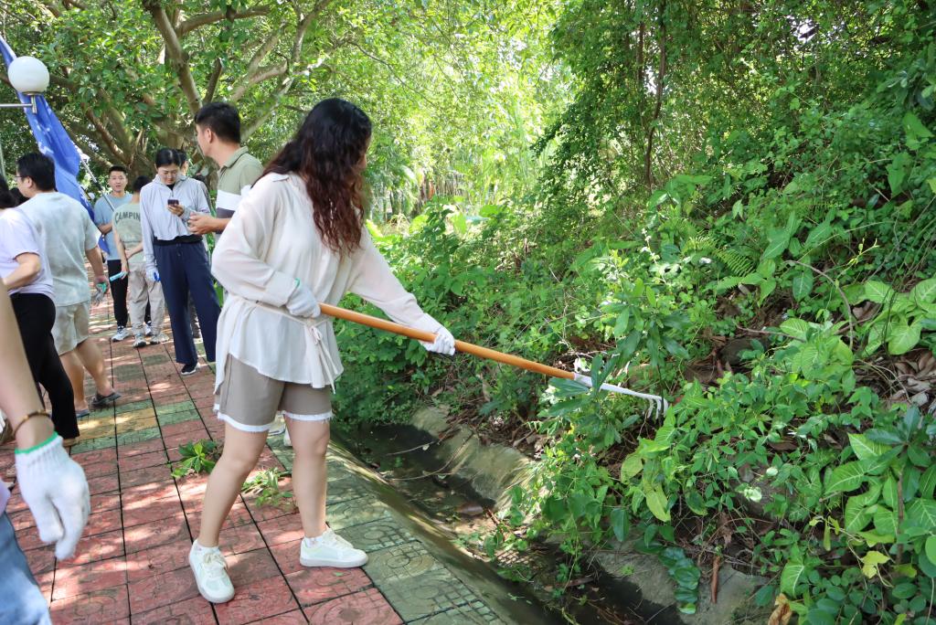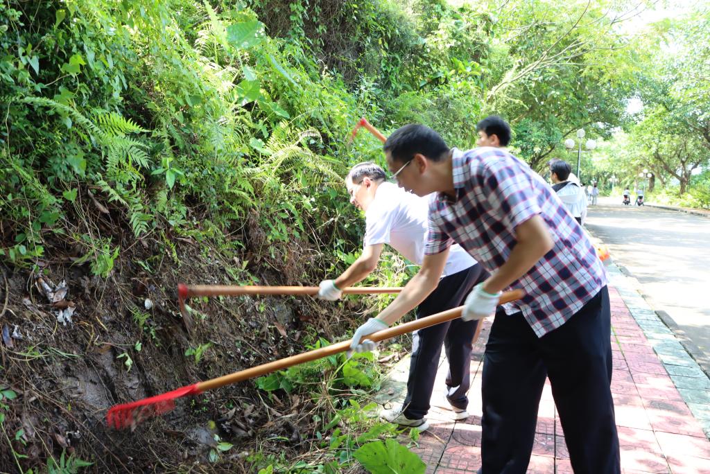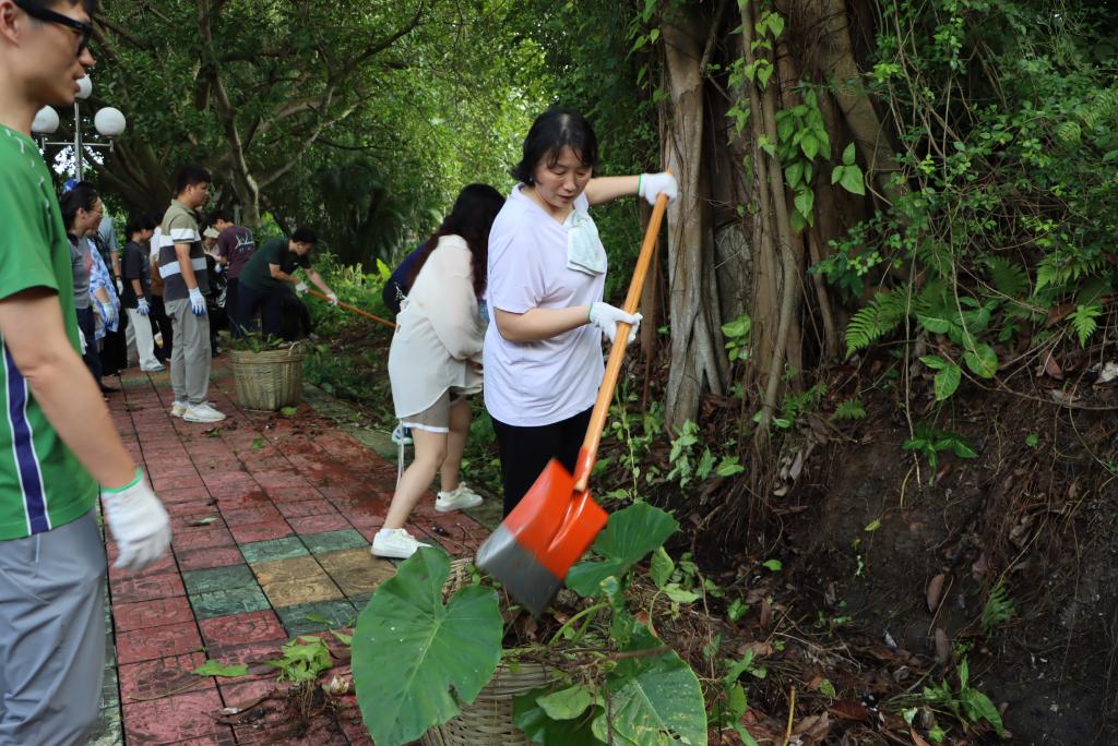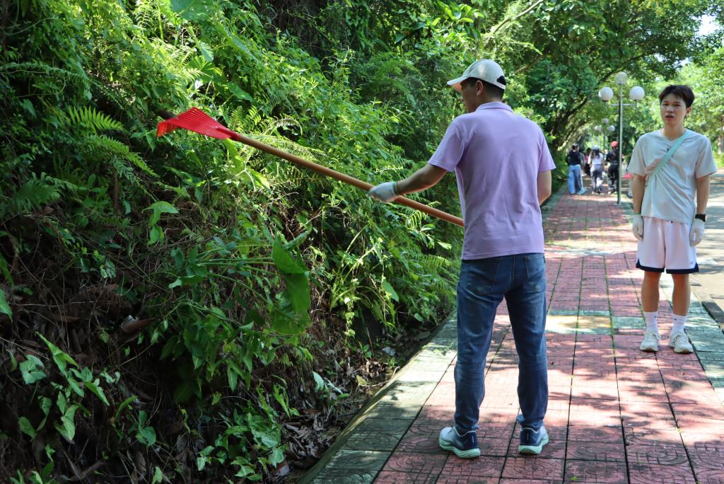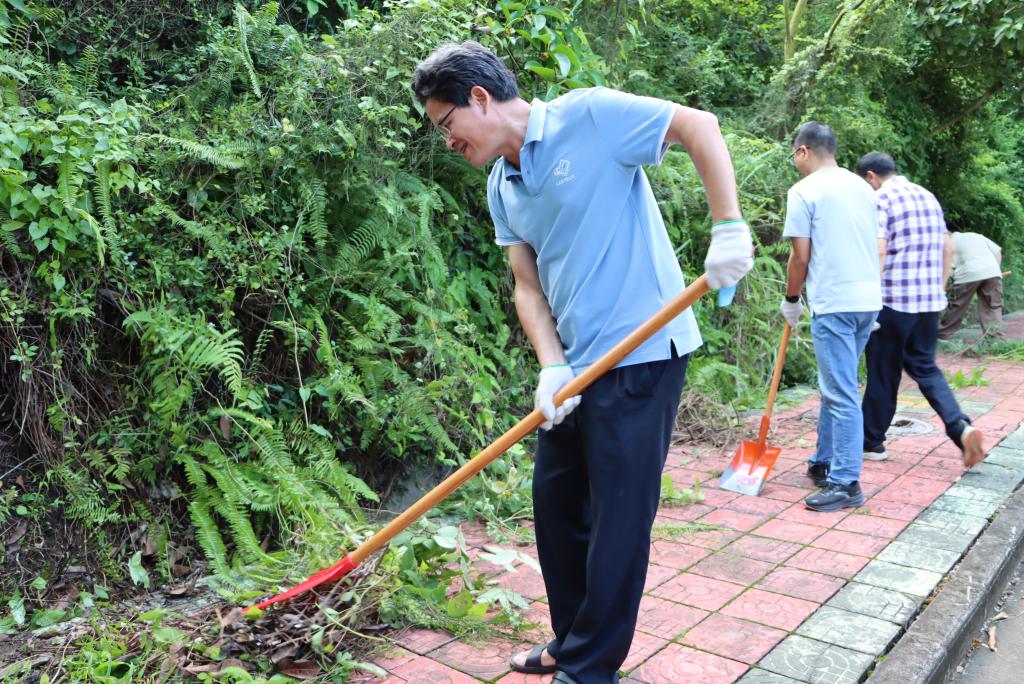 学院师生分工协作,对划分的东山公园第5区域开展全方位清洁。大家手持扫帚、锄头、铁铲、镰刀、耙子、垃圾袋等工具,重点清理了第5区域水沟及公园广场的杂树、杂草、攀藤植物等垃圾杂物,经过近两个小时的集中整治,公共区域环境焕然一新。