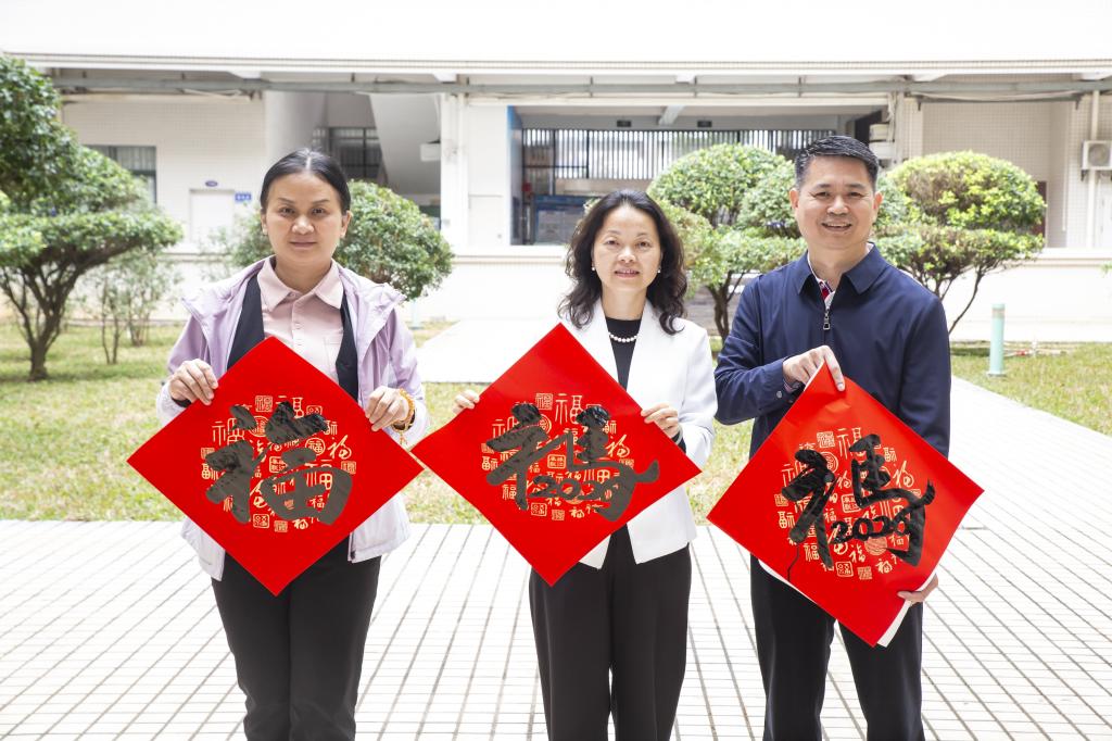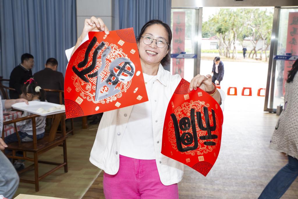 活动现场一派红火祥和,水产楼一楼大厅挂起灯笼、贴上春联,洋溢着浓浓的节日气氛。杨洲等校领导与师生们一起动手擀面团、包饺子、话家常,亲切询问同学们的学习进展与生活状况,现场笑语不断、温情流淌。校关工委副主任劳赞老师即席挥毫,为师生书写春联,送上真挚的新春祝福。