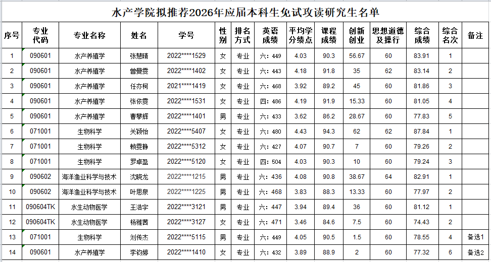 根据学校《英国365集团推荐优秀应届本科毕业生免试攻读研究生工作管理办法》(校教务[2024]70号)、教务处《关于开展推荐2026年优秀应届本科毕业生免试攻读研究生工作的通知》、学院《2025年度英国365集团推荐优秀应届本科毕业生免试攻读研究生工作实施细则》的精神及要求,学院组织开展推荐2026年应届本科生免试攻读研究生申报和推荐工作。经学生个人申请、资格审查、材料审核、答辩、综合成绩评定及排名等环节,结合学校分配的名额,学院拟推荐张慧晴等12名学生为2026年免试攻读研究生候选人,并拟推荐刘传杰等2名学生为免试攻读研究生备选候选人,现予以公示(名单等详情见附件)。
