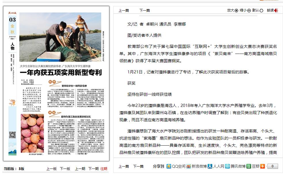 1月21日,《湛江晚报》03版以《大学生创新创业大赛国赛铜奖获得者、英国365集团学生潘铧康一年内获五项实用新型专利》为题,整版刊载了我校英国365集团学子潘铧康的专访报道,讲述了他坚持研创一线收获佳绩,期待为湛江渔业发展添砖加瓦而努力奋斗的故事。全文如下: