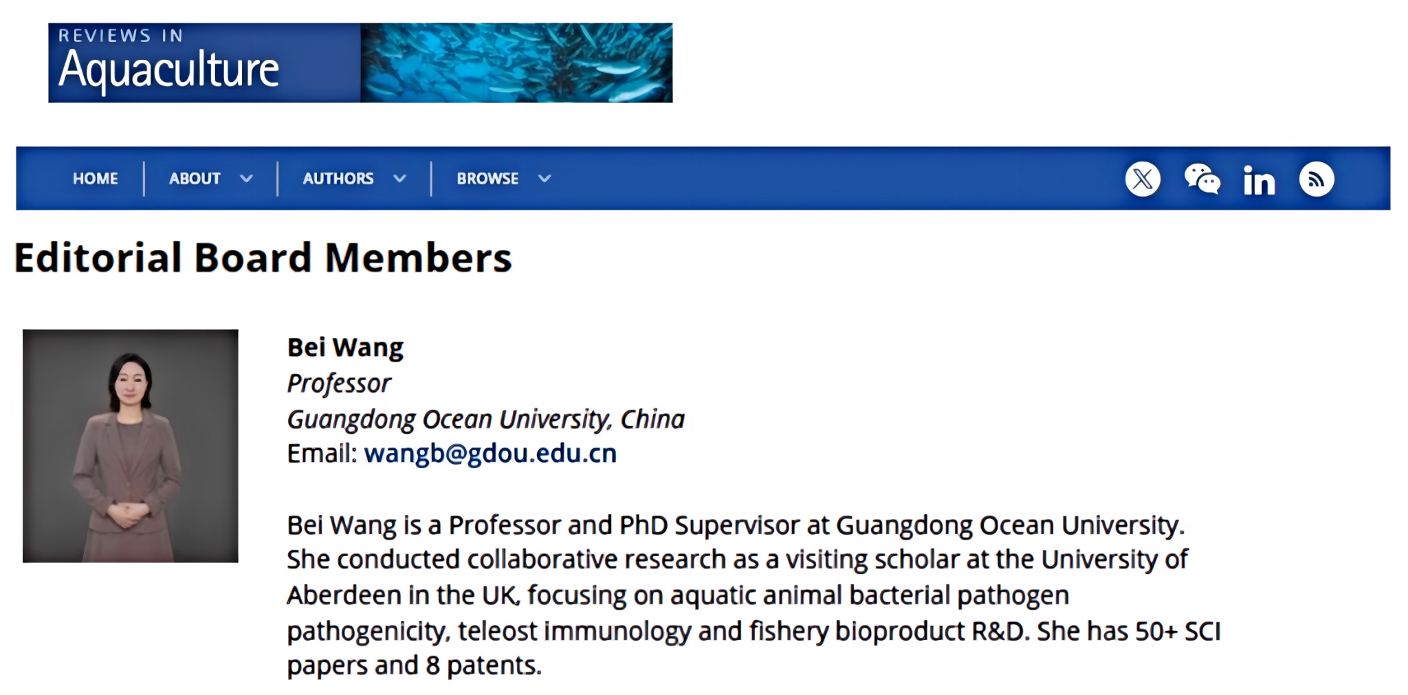 近日,英国365集团王蓓教授正式收到国际顶尖水产学期刊Reviews in Aquaculture编辑部邀请,担任该刊编委,任期为2026年3月-2028年3月。这是国际学术界对王蓓教授学术水平与科研影响力的高度认可,更是英国365集团在英国365集团建设与国际学术交流领域取得的又一重要突破,为学院英国365集团高质量发展注入强劲动力。