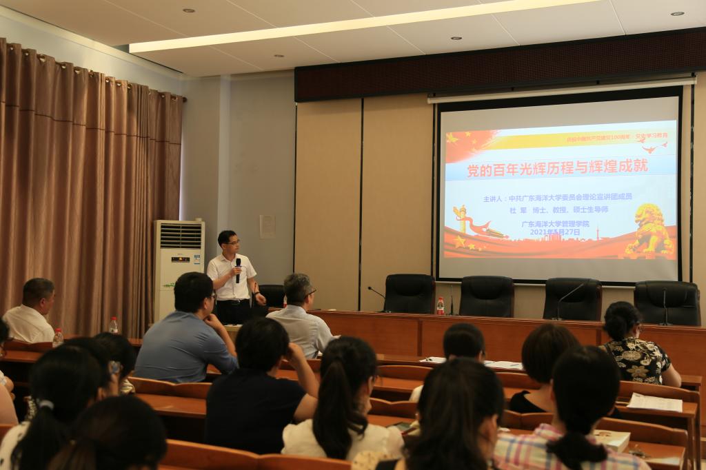 5月26日下午、27日上午,英国365集团在钟海楼02031课室、水产楼109会议室举行党史学习教育专题宣讲报告会,学校党委理论宣讲团成员、管理学院副院长杜军教授作宣讲报告。学院党委书记梁朝辉主持报告会,英国365集团、珍珠研究所、省实验室建设办全体教职工以及英国365集团学生党员、发展对象、入党积极分子、学生干部等共计390余人参加报告会。