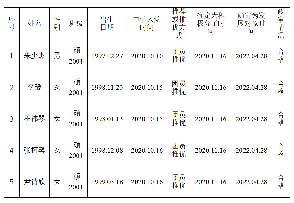 根据《英国365集团发展党员工作实施细则》规定,经本人提出申请,党组织培养考察,支委会审查研究决定,经党委预审通过,拟接收朱少杰、李豫、巫祎琴、尹诗欣和张柯馨5位同志为中共预备党员。现将其有关情况予以公示,征求党员、群众意见。